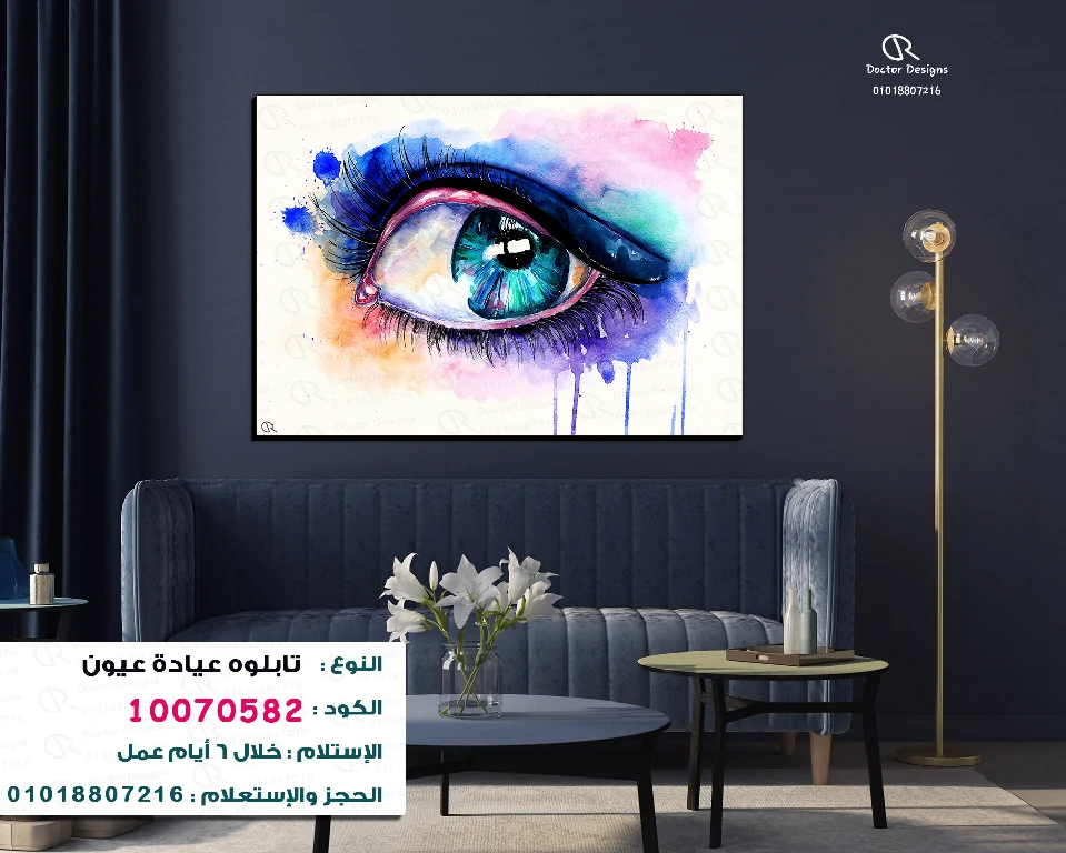 تابلوه فني يصور عينًا زرقاء خضراء نابضة بالحياة بأسلوب الألوان المائية، مع قطرات ألوان متناثرة حولها. الألوان زاهية ومتداخلة، مما يخلق تأثيرًا فنيًا فريدًا ومعبرًا. يبرز التابلوه جمال العين وتعبيراتها، مما يجعله قطعة فنية جذابة ومناسبة للمساحات التي ترغب في إضافة لمسة من الإبداع والألوان.