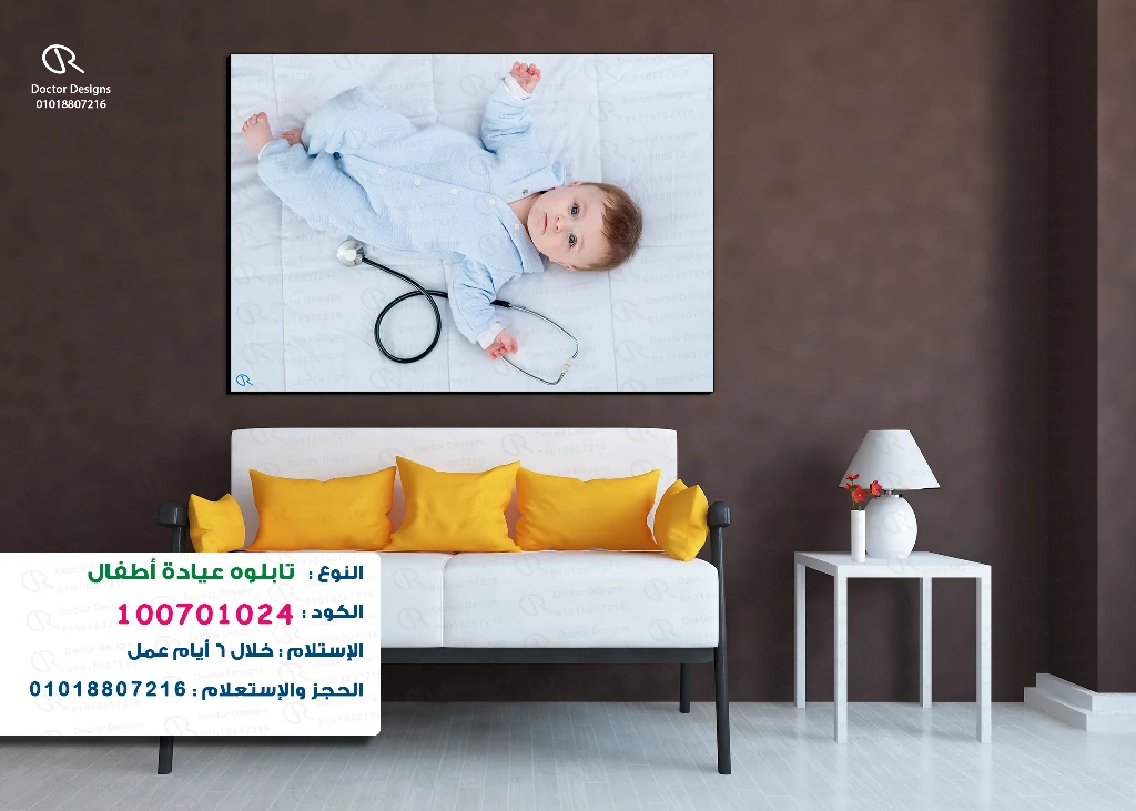 لتابلوه لعيادة أطفال، يظهر فيه طفل رضيع يرتدي ملابس زرقاء فاتحة ومستلقيًا على ظهره على غطاء سرير أبيض، وبجانبه سماعة طبية. ينظر الطفل إلى الكاميرا بنظرة هادئة وبريئة، مما يضفي لمسة من الهدوء والراحة على الصورة. يهدف التابلوه إلى خلق جو مريح وودود في عيادات الأطفال، ليساعد على تهدئة الصغار وذويهم.