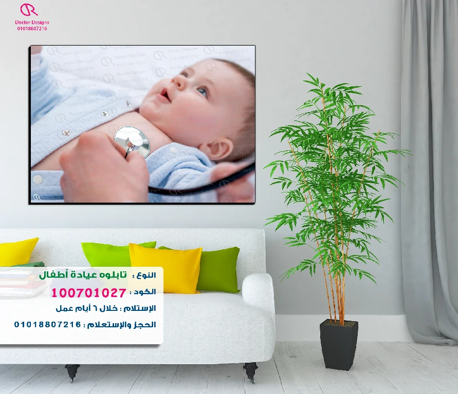 تابلوه لعيادة أطفال، يظهر فيه طفل رضيع ذو عينين زرقاوين فاتحتين ينظر إلى الأعلى أثناء فحص طبيبه له باستخدام السماعة الطبية على صدره. يعطي الطفل تعابير وجه هادئة ومطمئنة، مما يضفي لمسة من الأمان والبراءة على الصورة. هذا التابلوه يهدف إلى إضفاء جو من الثقة والراحة في عيادات الأطفال، مما يجعله إضافة مثالية لأي مساحة مخصصة للصغار.