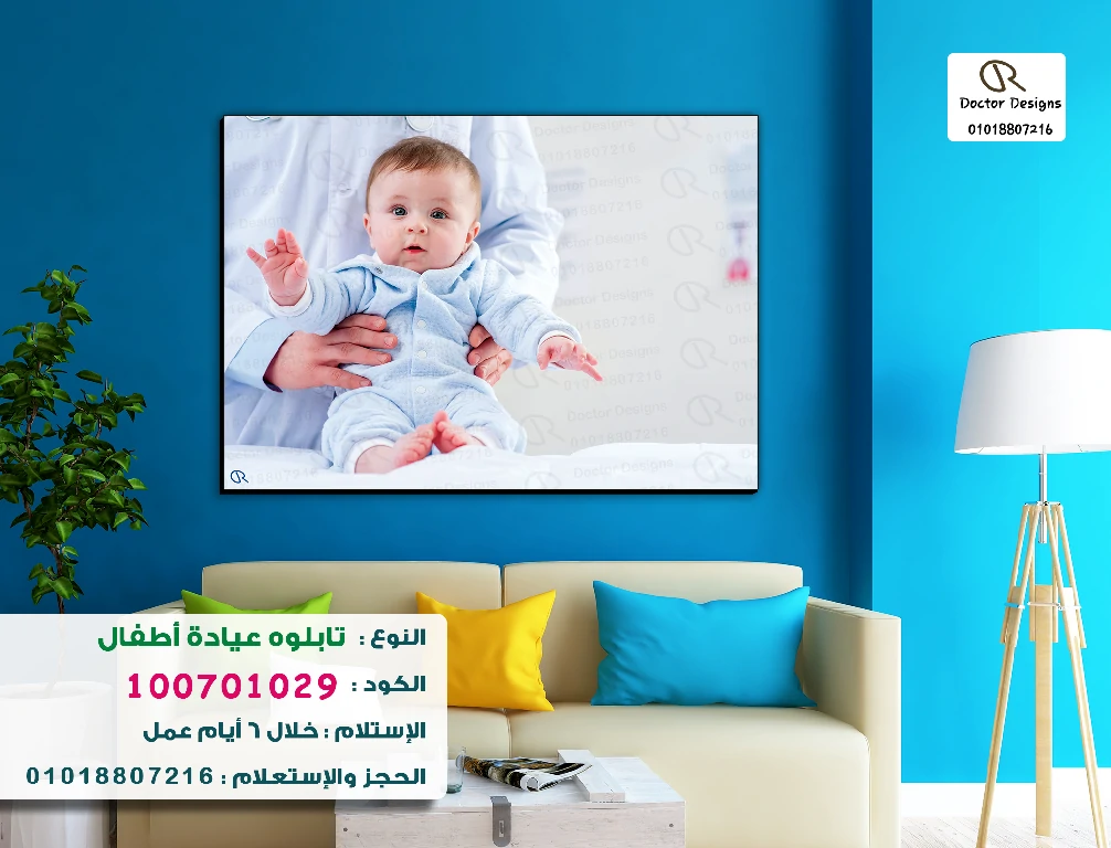 تابلوه لعيادة أطفال، يظهر فيه طفل رضيع ذو بشرة فاتحة وعينين واسعتين، يرتدي ملابس زرقاء فاتحة ويجلس على حضن شخص يرتدي معطفًا أبيض (طبيب أو ممرض). ينظر الطفل بتركيز إلى الأمام، مما يعطي إحساسًا بالهدوء والبراءة. يهدف هذا التابلوه إلى إضفاء جو من الأمان والثقة في عيادات الأطفال، مما يجعله مثاليًا لتهدئة الصغار وذويهم.