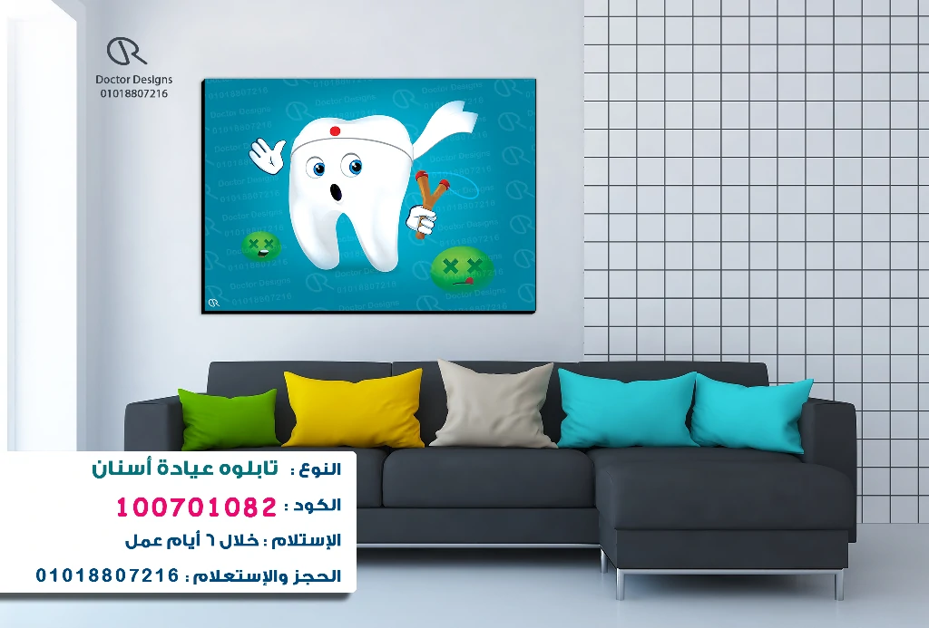 تابلوه فني يظهر فيه سن أبيض كرتوني غاضب يرفع يديه، ويحمل مقلاعًا موجّهًا نحو وجهين أخضرين حزينين يمثلان التسوس. التابلوه معلق فوق أريكة ركنية باللون الرمادي الداكن، مزينة بوسائد بألوان زاهية كالأخضر والأصفر والبيج والأزرق السماوي.