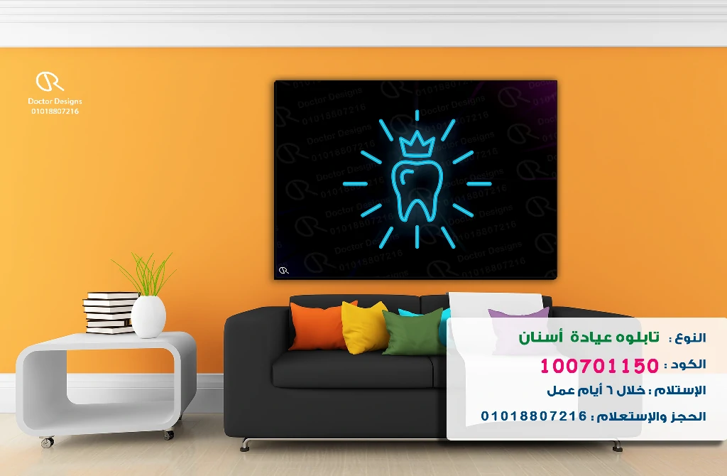 تابلوه يُظهر رسمًا فنيًا بالنيون لسن بشري يتوهج باللون الأزرق الفاتح، مع تاج يعلوه، مما يضفي عليه مظهرًا حديثًا ومميزًا. هذا التصميم الجرافيكي البسيط يعبر عن الإشراق والنظافة. اللوحة معلقة على حائط برتقالي ساطع، مما يخلق تباينًا لونيًا جذابًا يضيف حيوية للغرفة.