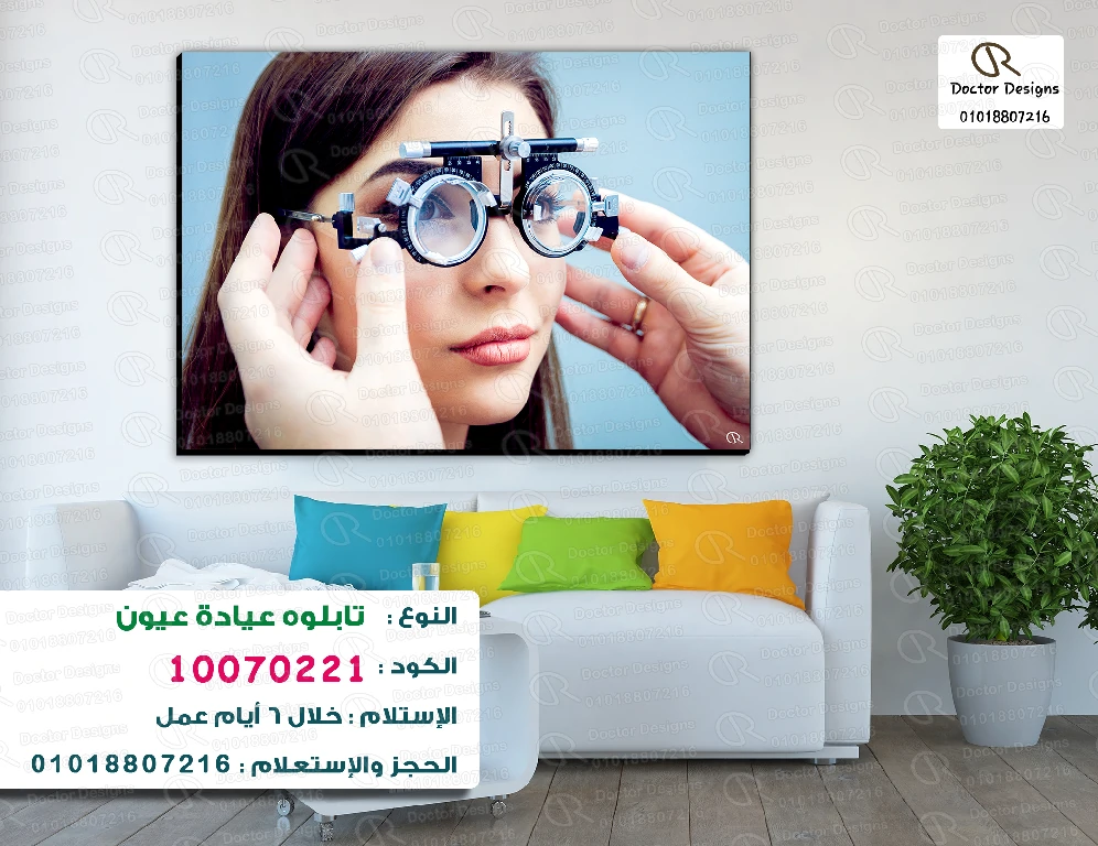 تابلوه يتميز بصورة مقربة وواضحة لامرأة شابة تخضع لفحص نظر. تظهر المرأة وهي ترتدي نظارة فحص النظر (phoropter)، وتعدل عليها بيديها، مما يوحي بالتركيز على عملية تحديد القياسات الدقيقة للبصر. يبرز التابلوه تفاصيل دقيقة لوجه المرأة والنظارة، مع خلفية زرقاء فاتحة تُبرز الصورة الرئيسية. يحيط بالصورة إطار أسود، وتظهر علامة مائية “Doctor Designs” مع رقم هاتف.