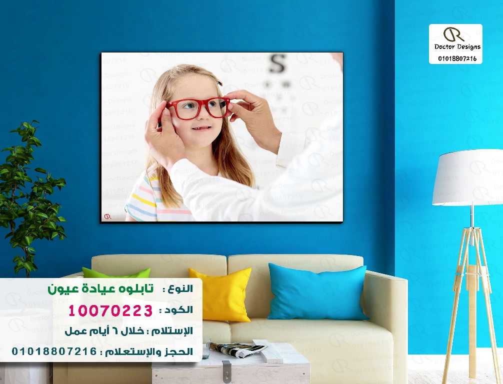 تابلوه يعرض صورة دافئة لطفلة صغيرة تخضع لفحص نظر. تظهر يدان ترتديان معطفًا أبيض (يد الطبيب) وهما تضعان نظارة طبية حمراء اللون على وجه الطفلة، التي تنظر بابتسامة خفيفة. في الخلفية، تظهر لوحة فحص البصر (Snellen chart)، مما يؤكد السياق الطبي للصورة، مع خلفية زرقاء داكنة تبرز اللقطة الرئيسية. يحيط بالصورة إطار أسود، وتظهر علامة مائية “Doctor Designs” مع رقم هاتف.