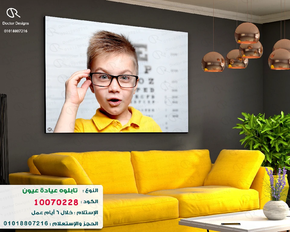 تابلوه يتميز بصورة مقربة وواضحة لطفل صغير يرتدي نظارة طبية. تظهر على وجه الطفل تعابير دهشة أو استغراب، بينما يقوم بتعديل النظارة بيده، مما يضفي لمسة من الحيوية والفكاهة على الصورة. في الخلفية، تظهر لوحة فحص البصر (Snellen chart) بشكل باهت، مما يوضح السياق المتعلق بطب العيون. يحيط بالصورة إطار أسود، وتظهر علامة مائية “Doctor Designs” مع رقم هاتف.