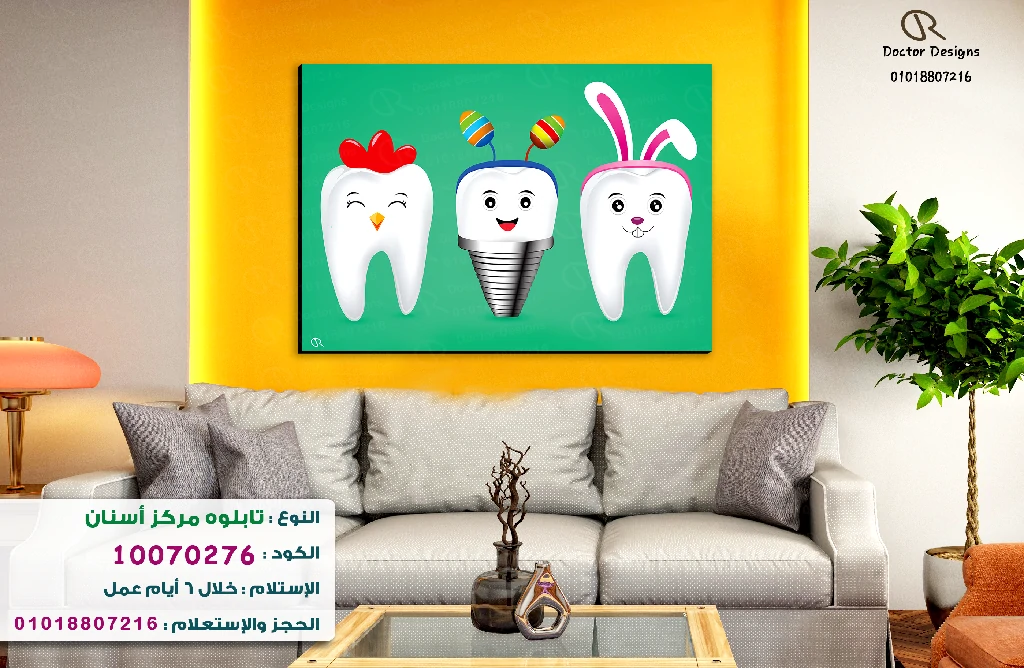 تابلوه ثلاث أسنان كرتونية لطيفة وذات تعبيرات وجه مرحة، حيث تظهر إحداها بقبعة دجاج، والأخرى بقرنين ملونين، والأخيرة بأذني أرنب، مما يضفي لمسة من الفكاهة والبراءة. اللوحة معلقة على حائط أصفر زاهٍ، مما يخلق تناغمًا لونيًا مبهجًا مع الأريكة الرمادية المريحة المزينة بوسائد ناعمة. هذا التابلوه يُعتبر إضافة ممتازة لغرف انتظار الأطفال في عيادات الأسنان، حيث يبعث على الراحة والبهجة.