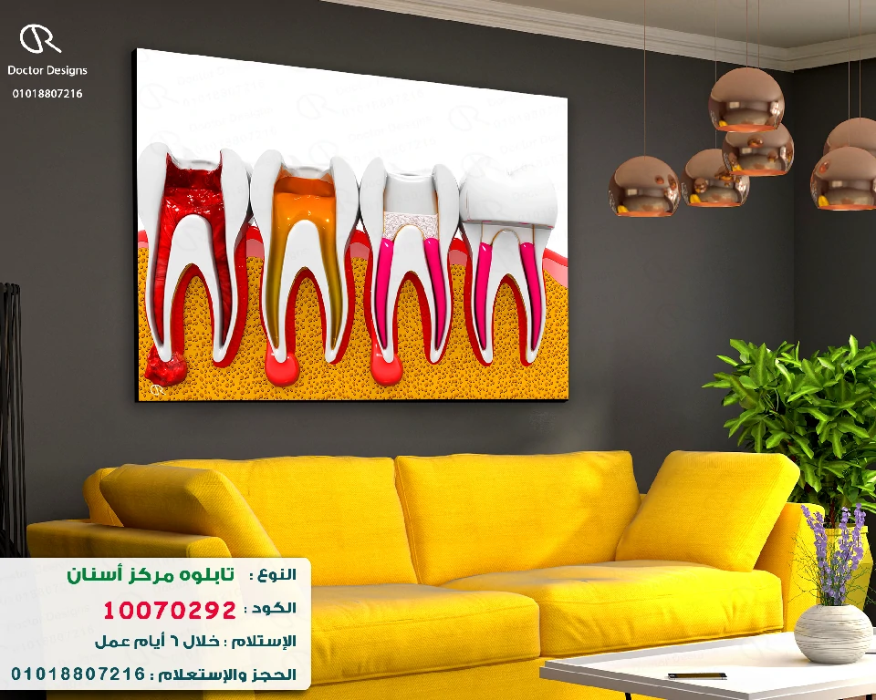 تابلوه يعرض مقطعًا عرضيًا تفصيليًا لخمسة أسنان، تظهر التركيب الداخلي لكل سن، من العصب إلى الجذر، بألوان حية وواقعية. يوضح التابلوه بوضوح البنية المعقدة للأسنان المختلفة، مما يجعله مثاليًا للتعليم أو العرض في عيادة أسنان متخصصة