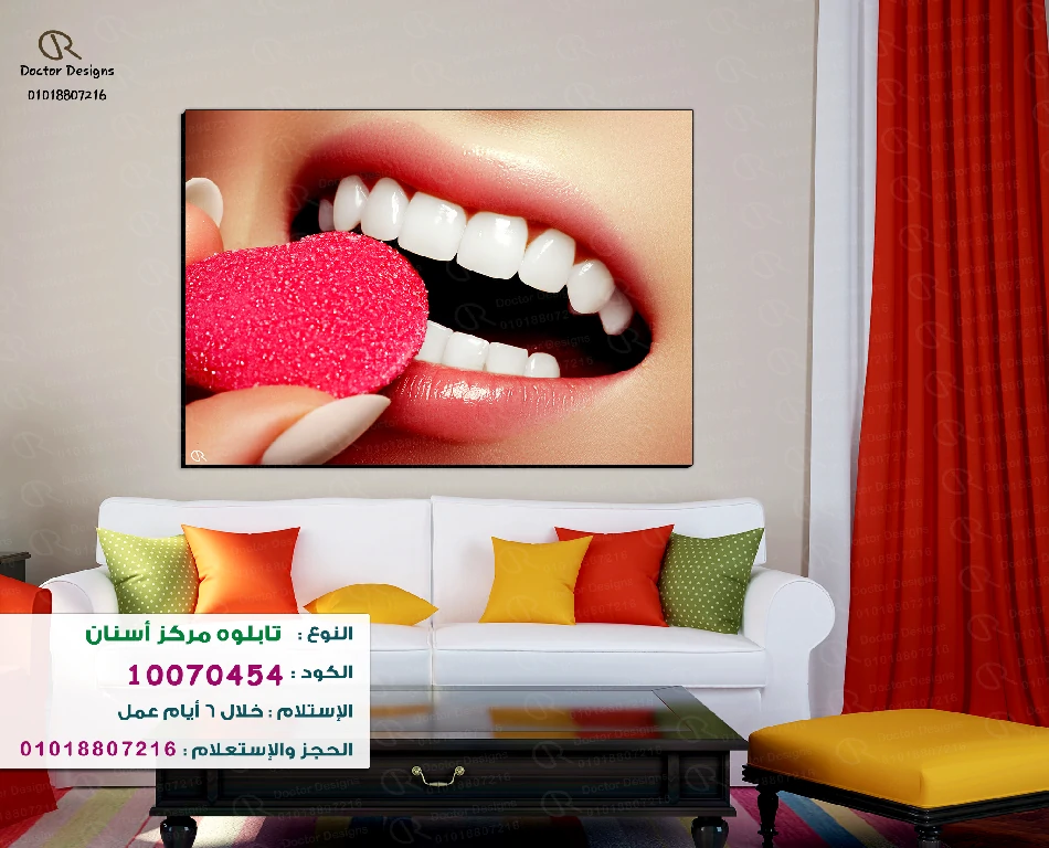 تابلوه يعرض صورة مقربة لابتسامة جميلة ذات أسنان بيضاء ناصعة، بينما تمسك يدٌ بقطعة حلوى حمراء زاهية بالقرب من الفم. توحي الصورة بالاستمتاع مع الحفاظ على صحة الأسنان