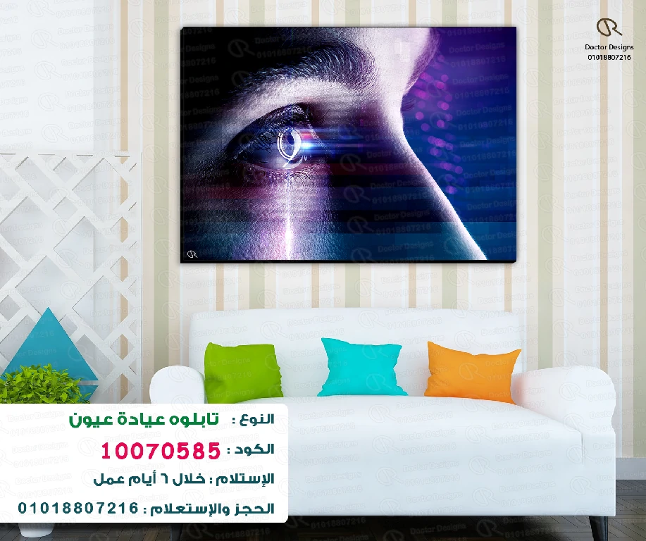 تابلوه يتميز بصورة فنية لعين إنسانية بتركيز عالٍ، تظهر فيها انعكاسات ضوئية وعناصر رقمية متوهجة باللونين الأزرق والبنفسجي، مما يوحي بتقنية متقدمة لفحص العيون أو رؤية مستقبلية معززة رقميًا. الصورة تعطي إحساسًا بالتقنية والدقة في مجال العناية بالبصر، مع لمسة من الغموض والعمق.