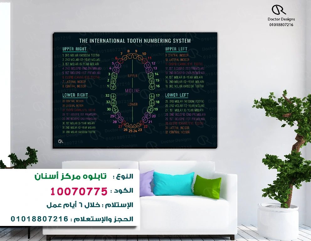 تابلوه يحتوي على مخطط لنظام ترقيم الأسنان الدولي، مقسمًا إلى فكين علوي وسفلي، يوضح تسلسل الأرقام لكل سن مع تصنيفاتها