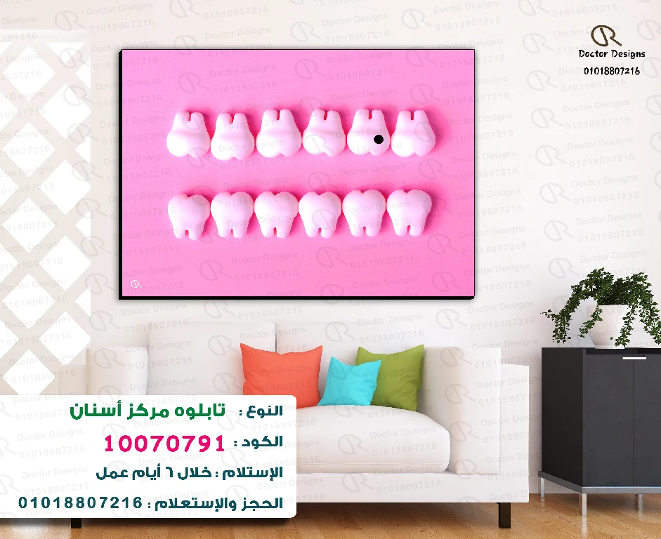 تابلوه جذاب، على خلفية وردية، صفين من الأسنان الصناعية البيضاء اللامعة، يمثلان الفكين العلوي والسفلي. تتراص الأسنان بدقة، مع وجود سن واحد في الفك العلوي يبرز بسبب تسوس واضح أو نقطة سوداء. يضفي التباين بين البياض الناصع للأسنان واللون الوردي النابض بالحياة للتابلوه لمسة فنية فريدة