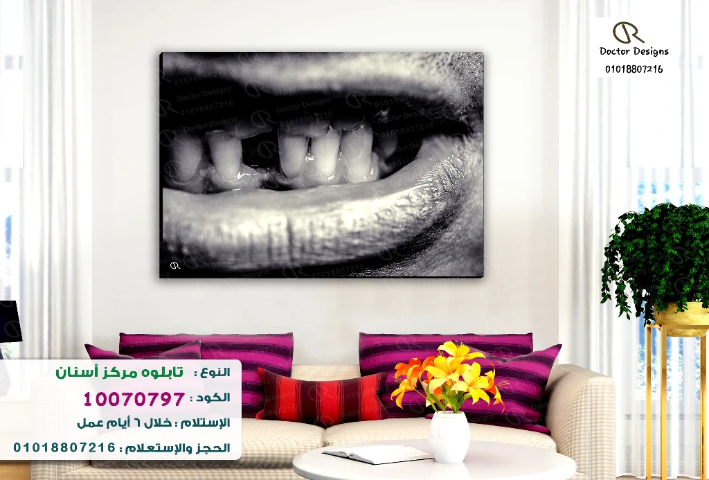تابلوه يظهر منظرًا مقربًا لفم وأسنان بالأبيض والأسود، مع التركيز على تفاصيل الأسنان واللثة. تُبرز هذه الصورة الجانب الواقعي للأسنان، وربما تشير إلى الحاجة للرعاية والاهتمام بالصحي بالفم. اللوحة معلقة فوق أريكة بلون فاتح، مزينة بوسائد مخططة باللونين الأحمر والأرجواني، مما يضفي لمسة من الأناقة والتباين اللوني. هذا التابلوه مناسب لمراكز الأسنان التي ترغب في إظهار الواقعية والاحترافية في مجال طب الأسنان.
