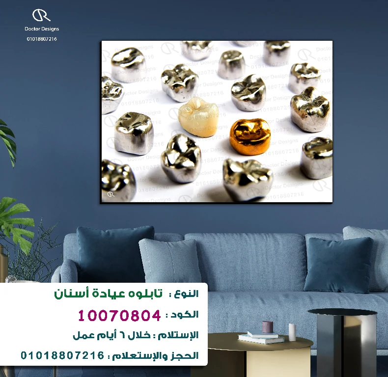 تابلوه يظهر مجموعة من تيجان الأسنان الصناعية اللامعة، بتفاصيل واضحة ودقيقة. تبرز بينها تيجان بلون فضي وذهبي، بالإضافة إلى تاج بلون السن الطبيعي، مما يعكس التنوع في المواد والخيارات المتاحة في طب الأسنان التعويضي. اللوحة معلقة على حائط أزرق داكن، مما يخلق خلفية أنيقة تبرز تفاصيل التيجان. يُعد هذا التابلوه إضافة ممتازة لعيادات الأسنان، حيث يجمع بين الجمالية الفنية والتخصص في مجال طب الأسنان.