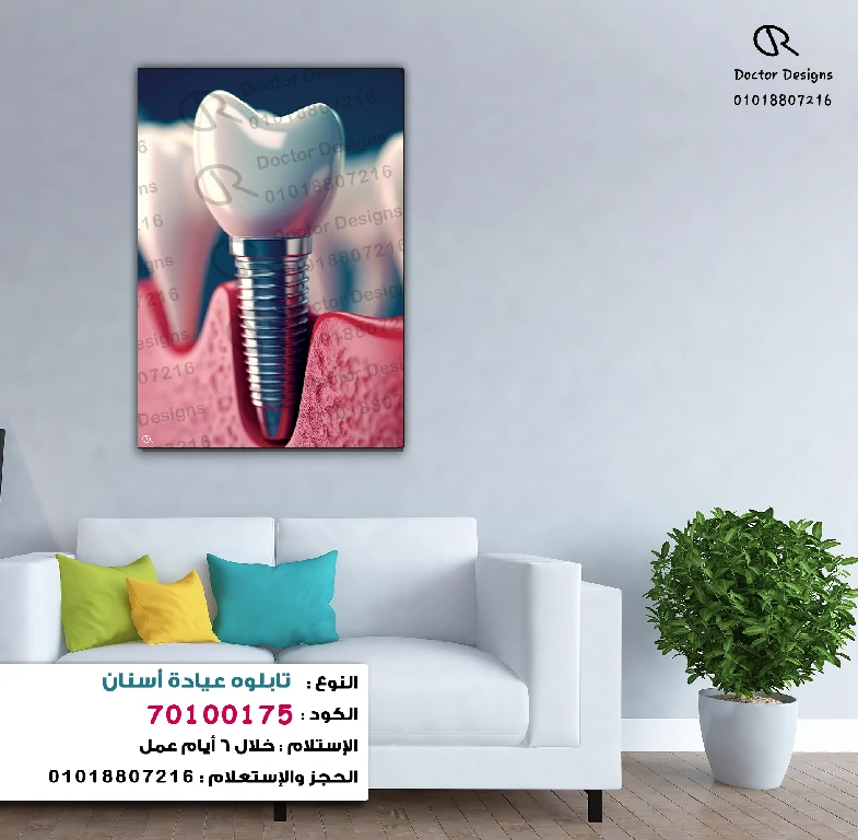 تابلوه يظهر منظرًا مقربًا لزرعة أسنان صناعية بيضاء مثبتة داخل اللثة، مع تفاصيل واضحة للبرغي المعدني، مما يبرز الدقة والتقنية في طب الأسنان الحديث. اللوحة معلقة على حائط رمادي فاتح، مما يوفر خلفية هادئة تبرز ألوان التابلوه. توجد أسفل اللوحة أريكة بيضاء عصرية مزينة بوسائد بألوان زاهية من الأخضر والأصفر والأزرق الفيروزي، مما يضيف لمسة من الحيوية. يُعد هذا التابلوه خيارًا ممتازًا لعيادات الأسنان، حيث يجمع بين الجانب التوضيحي والجمالي.
