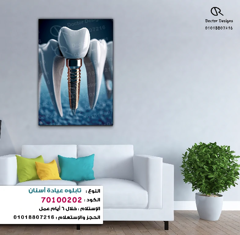 تابلوه يظهر منظرًا مقربًا لزرعة أسنان صناعية بيضاء بارزة في المنتصف، محاطة بأسنان أخرى تظهر بشكل ظل أزرق خافت في الخلفية، مما يبرز الزرعة بشكل رئيسي ويوحي بالدقة والاحترافية. اللوحة معلقة على حائط رمادي فاتح، مما يوفر خلفية هادئة تتناسب مع الديكور. توجد أسفل اللوحة أريكة بيضاء عصرية مزينة بوسائد بألوان زاهية من الأخضر والأصفر والأزرق الفيروزي، مما يضيف لمسة من الحيوية. يُعد هذا التابلوه خيارًا ممتازًا لعيادات الأسنان، حيث يجمع بين الجانب التوضيحي والجمالي، ويسلط الضوء على التقنيات الحديثة في طب الأسنان.