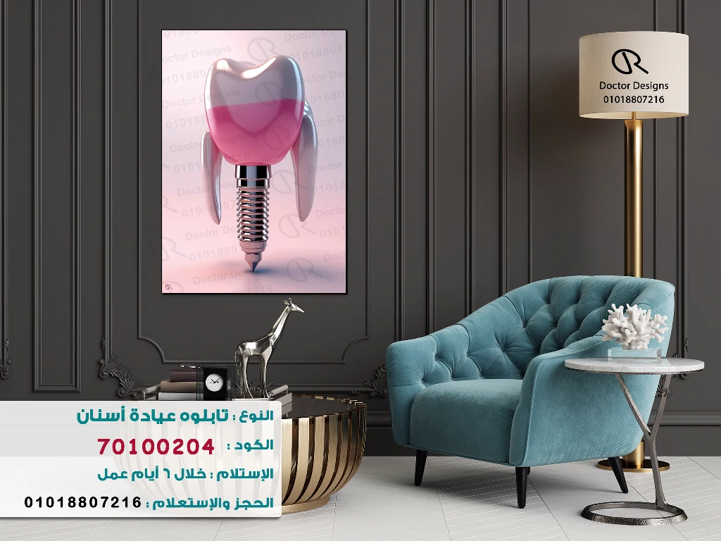 تابلوه يظهر منظرًا مقربًا لسن بشري بتصميم فني يجمع بين اللونين الأبيض والوردي، مع جزء معدني يشبه الزرعة في الأسفل، مما يعطي إيحاءً بالتركيب الحديث والتجميلي. تبرز اللوحة الأبعاد الثلاثية للسن، مما يضفي عليها طابعًا جذابًا ومبتكرًا. اللوحة معلقة على حائط رمادي داكن مزخرف، مما يوفر خلفية أنيقة تتناسب مع الديكور العصري الذي يضم كرسيًا أزرق فاتحًا وطاولة جانبية. يُعد هذا التابلوه إضافة ممتازة لعيادات الأسنان، حيث يجمع بين الجمالية الفنية والتخصص في مجال طب الأسنان.