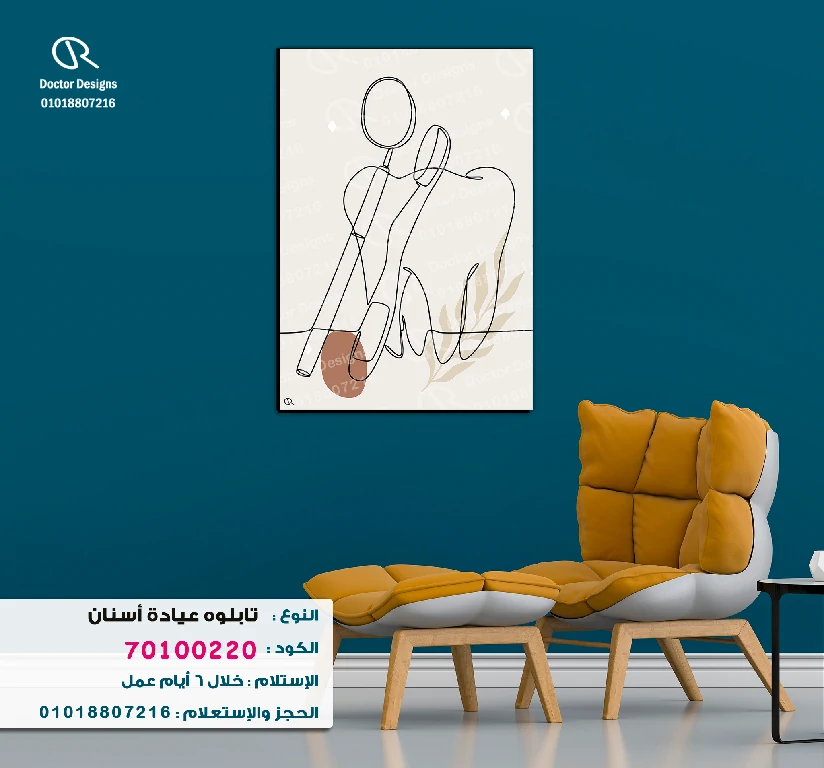 تابلوه يصور سنًا وأداة طبيب أسنان مرسومة بأسلوب “رسم بخط واحد” (One-line drawing) بسيط وأنيق، مع لمسات من اللون البني الفاتح وورقة شجر مجردة. يعكس التصميم بساطة فنية وجمالًا عصريًا في سياق طب الأسنان.