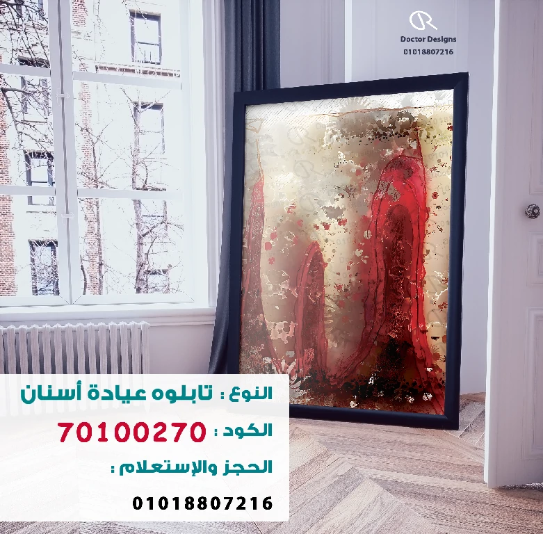 التابلوه يصور مجموعة من جذور الأسنان بأسلوب تجريدي، حيث تتخللها خطوط حمراء داكنة على خلفية فاتحة مع لمسات من الألوان الترابية والذهبية. يعكس التصميم لمسة فنية عميقة ومختلفة في سياق طب الأسنان.