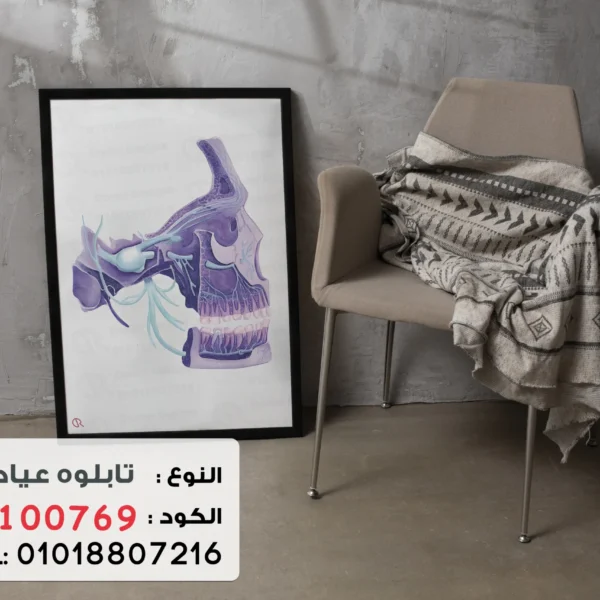 تابلوه يُظهر مقطعًا عرضيًا لسن بشري، حيث يتم إجراء عملية علاج جذور، مع أدوات طب الأسنان في منتصف السن. تظهر تفاصيل دقيقة للأنسجة الداخلية للسن والأدوات الطبية المستخدمة.