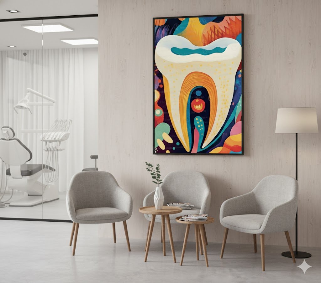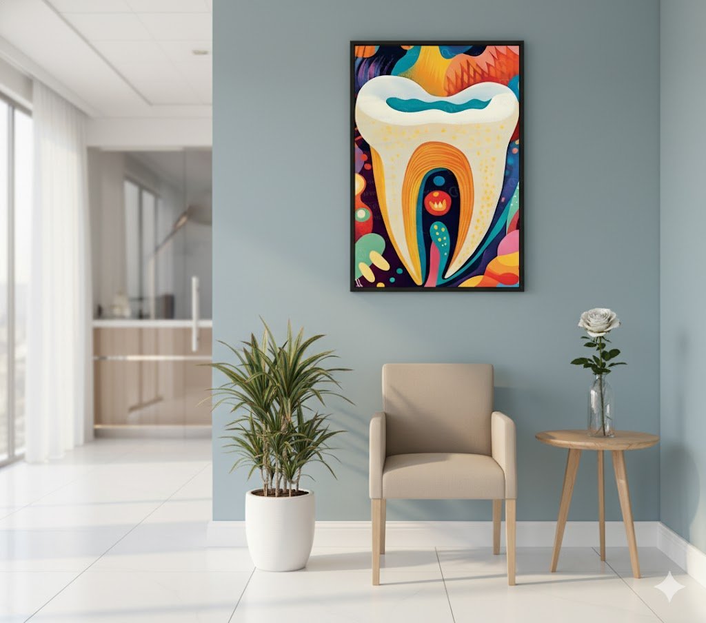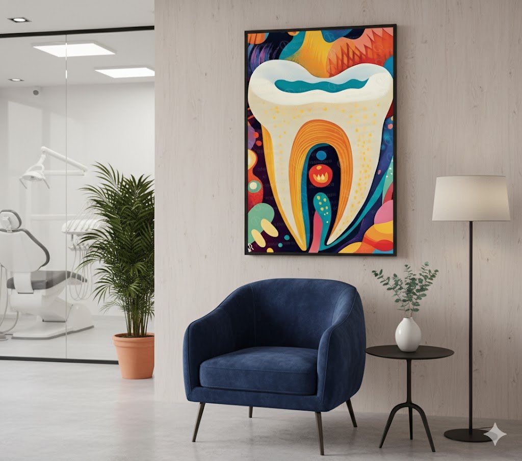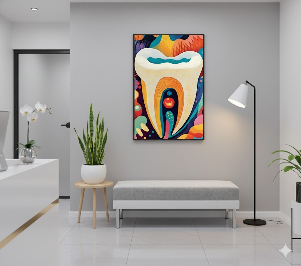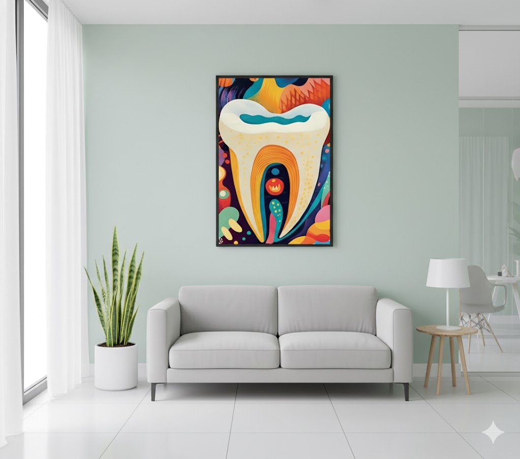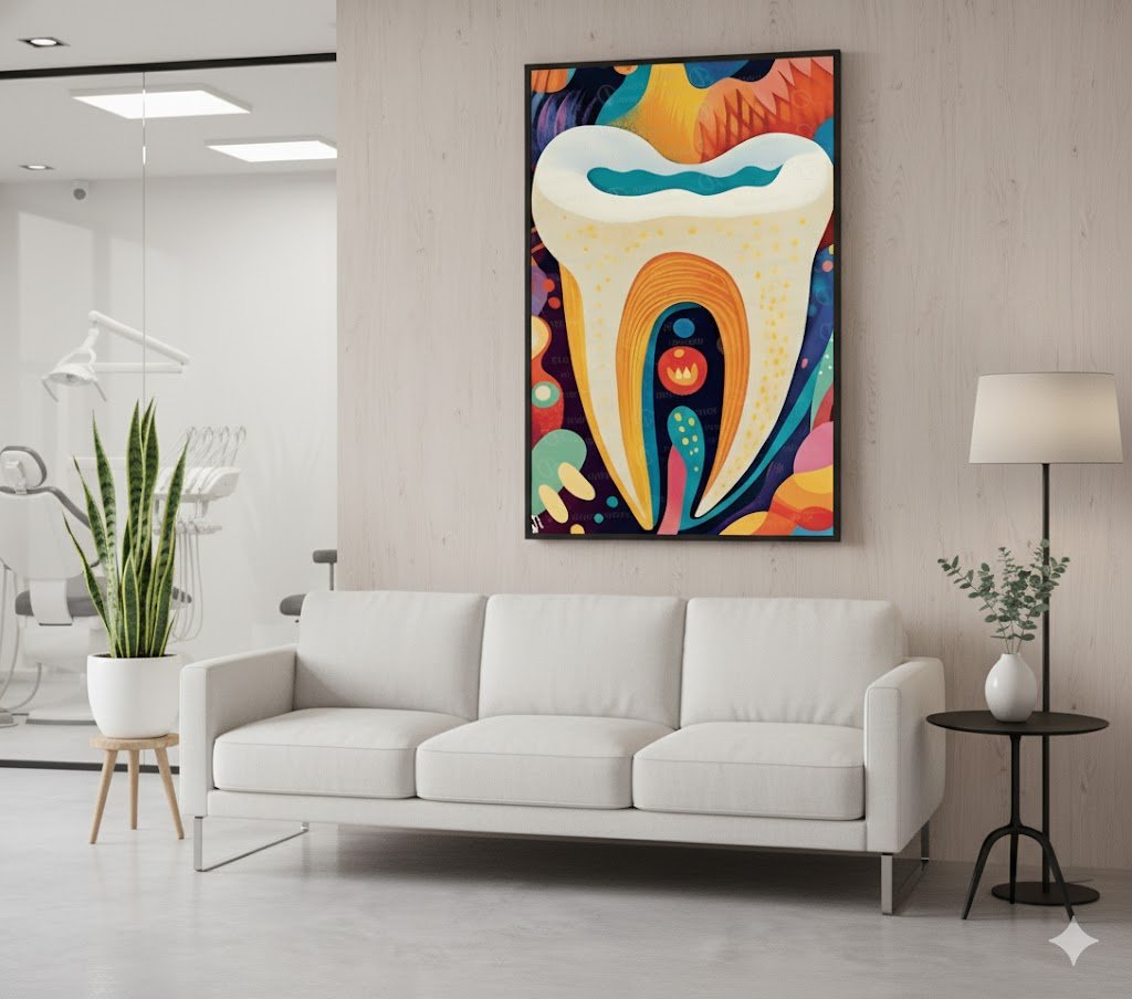 تابلوه يُظهر تصميمًا توضيحيًا لسن بشري بألوان دافئة ومتدرجة من البرتقالي والأحمر، مع تقسيمات جانبية تُشير إلى أجزاء السن الداخلية. يعكس هذا التصميم الفني اهتمامًا بالأسنان بطريقة جذابة ومبسطة، مما يجعله مناسبًا لعيادات الأسنان