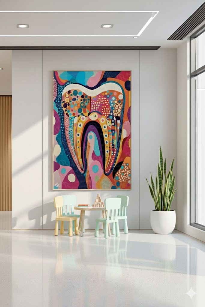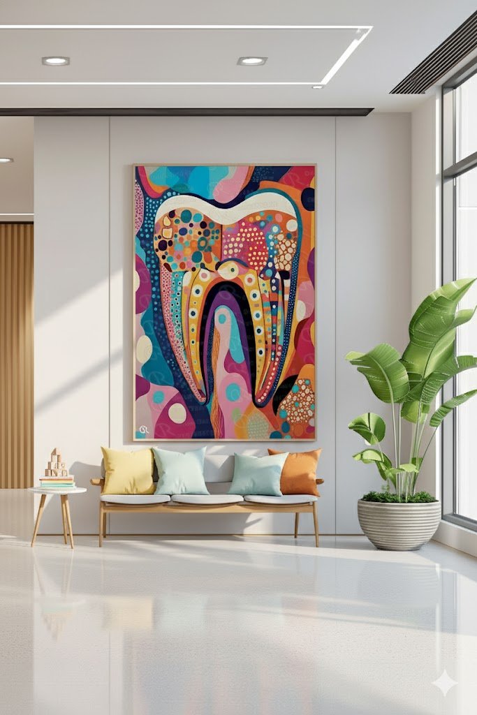 تابلوه يُظهر تصميمًا توضيحيًا لسن بشري بألوان دافئة ومتدرجة من البرتقالي والأحمر، مع تقسيمات جانبية تُشير إلى أجزاء السن الداخلية. يعكس هذا التصميم الفني اهتمامًا بالأسنان بطريقة جذابة ومبسطة، مما يجعله مناسبًا لعيادات الأسنان