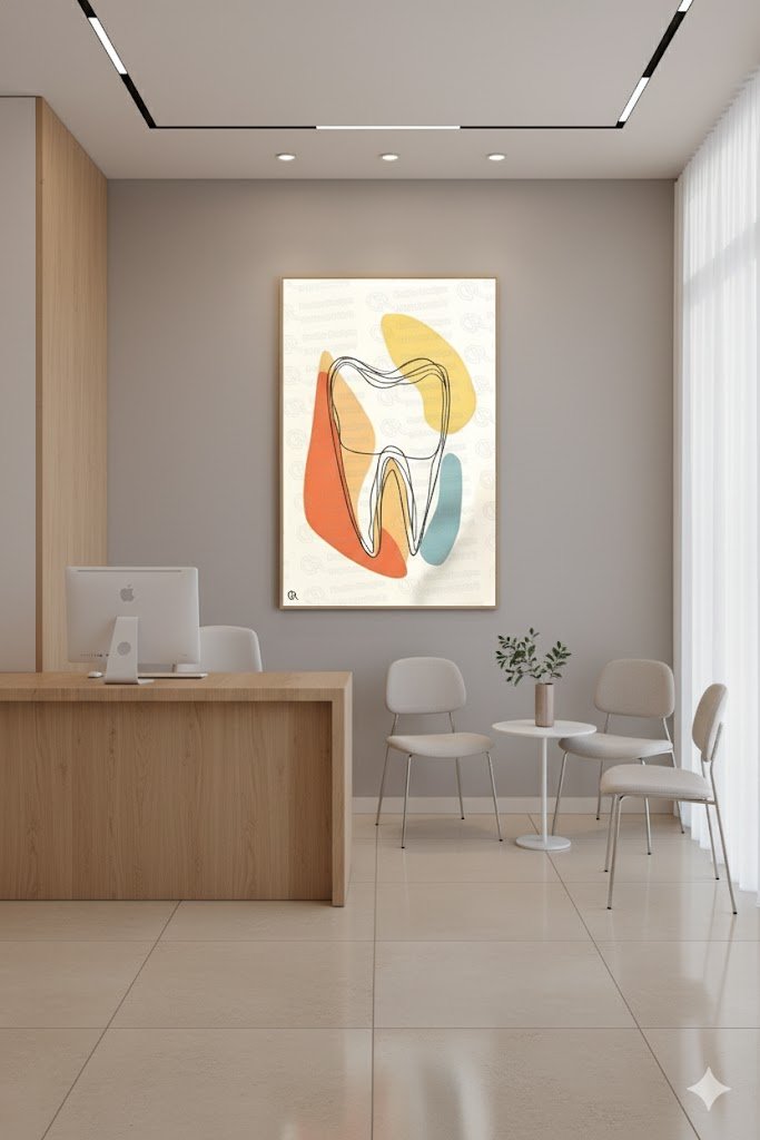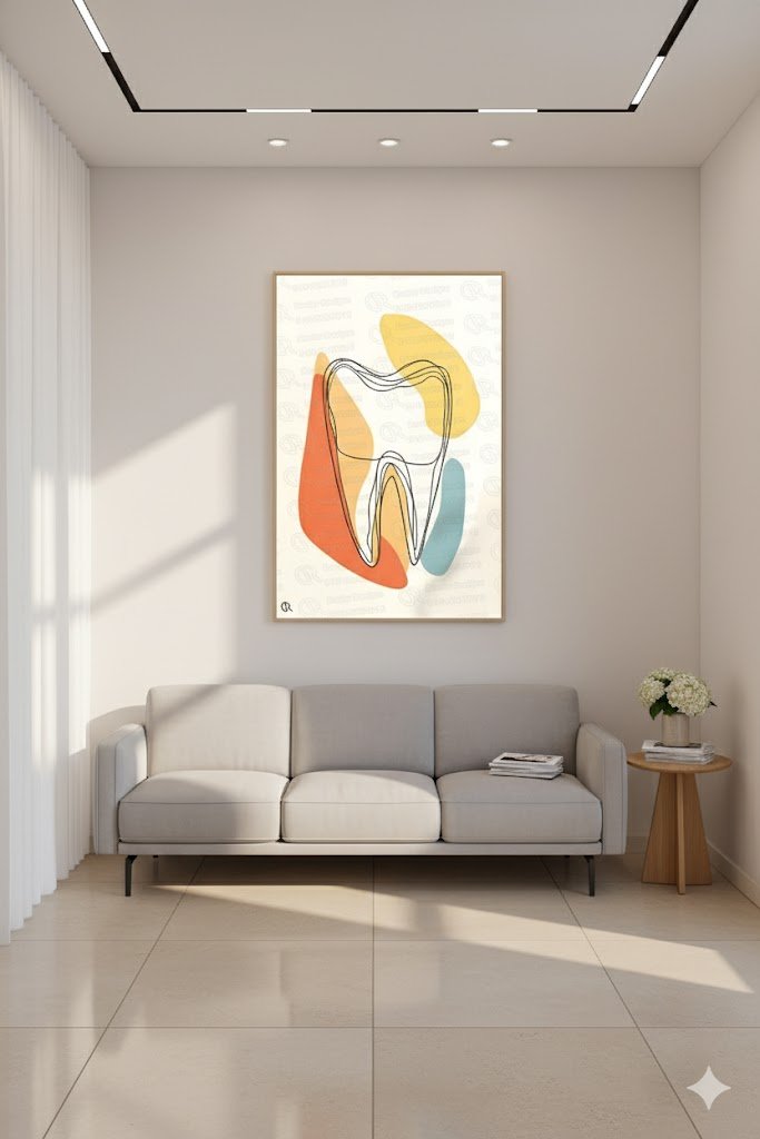 تابلوه يُظهر تصميمًا توضيحيًا لسن بشري بألوان دافئة ومتدرجة من البرتقالي والأحمر، مع تقسيمات جانبية تُشير إلى أجزاء السن الداخلية. يعكس هذا التصميم الفني اهتمامًا بالأسنان بطريقة جذابة ومبسطة، مما يجعله مناسبًا لعيادات الأسنان