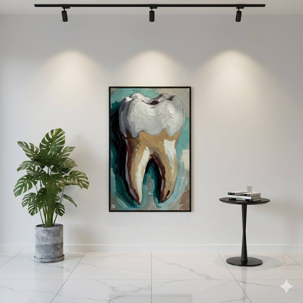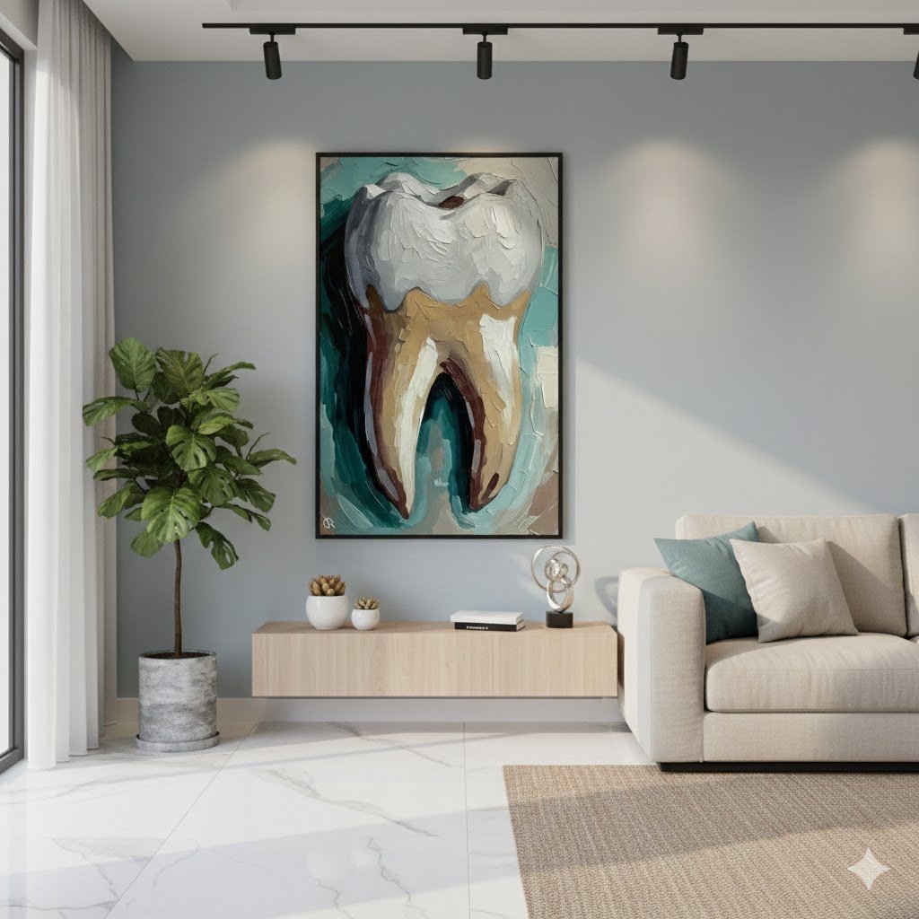 تابلوه يُظهر تصميمًا توضيحيًا لسن بشري بألوان دافئة ومتدرجة من البرتقالي والأحمر، مع تقسيمات جانبية تُشير إلى أجزاء السن الداخلية. يعكس هذا التصميم الفني اهتمامًا بالأسنان بطريقة جذابة ومبسطة، مما يجعله مناسبًا لعيادات الأسنان
